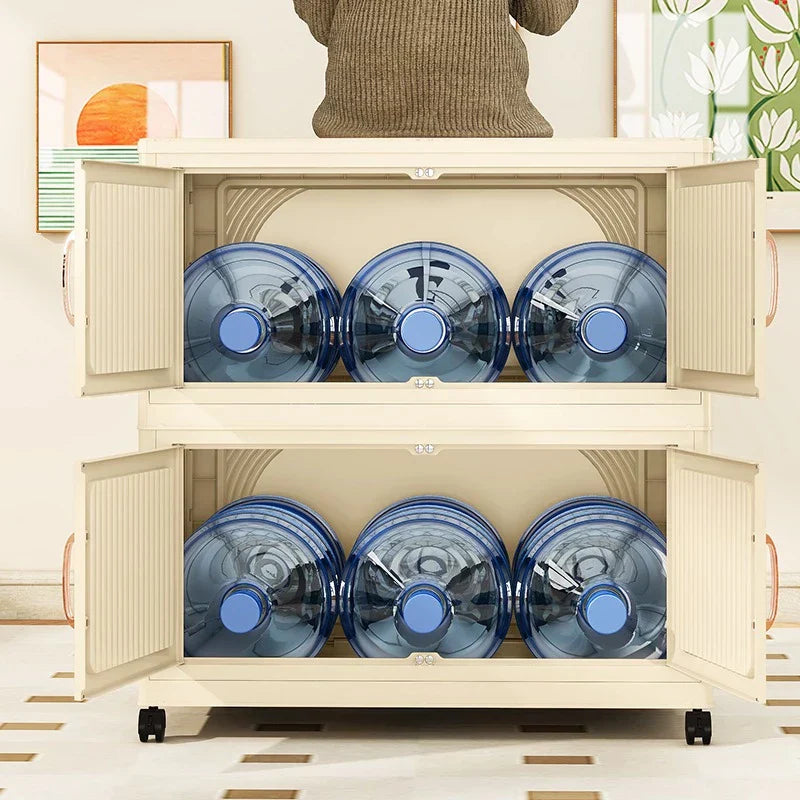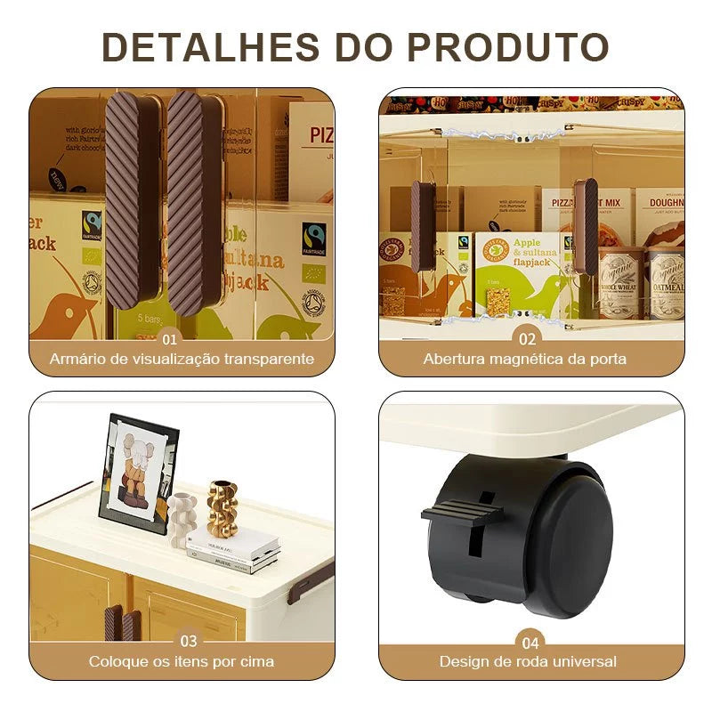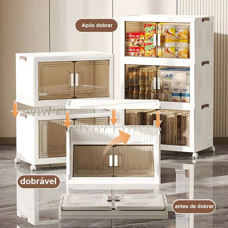 As portas com travas seguras facilitam o acesso aos itens sem precisar desmontar a pilha, e as rodinhas embutidas tornam o deslocamento leve e prático.